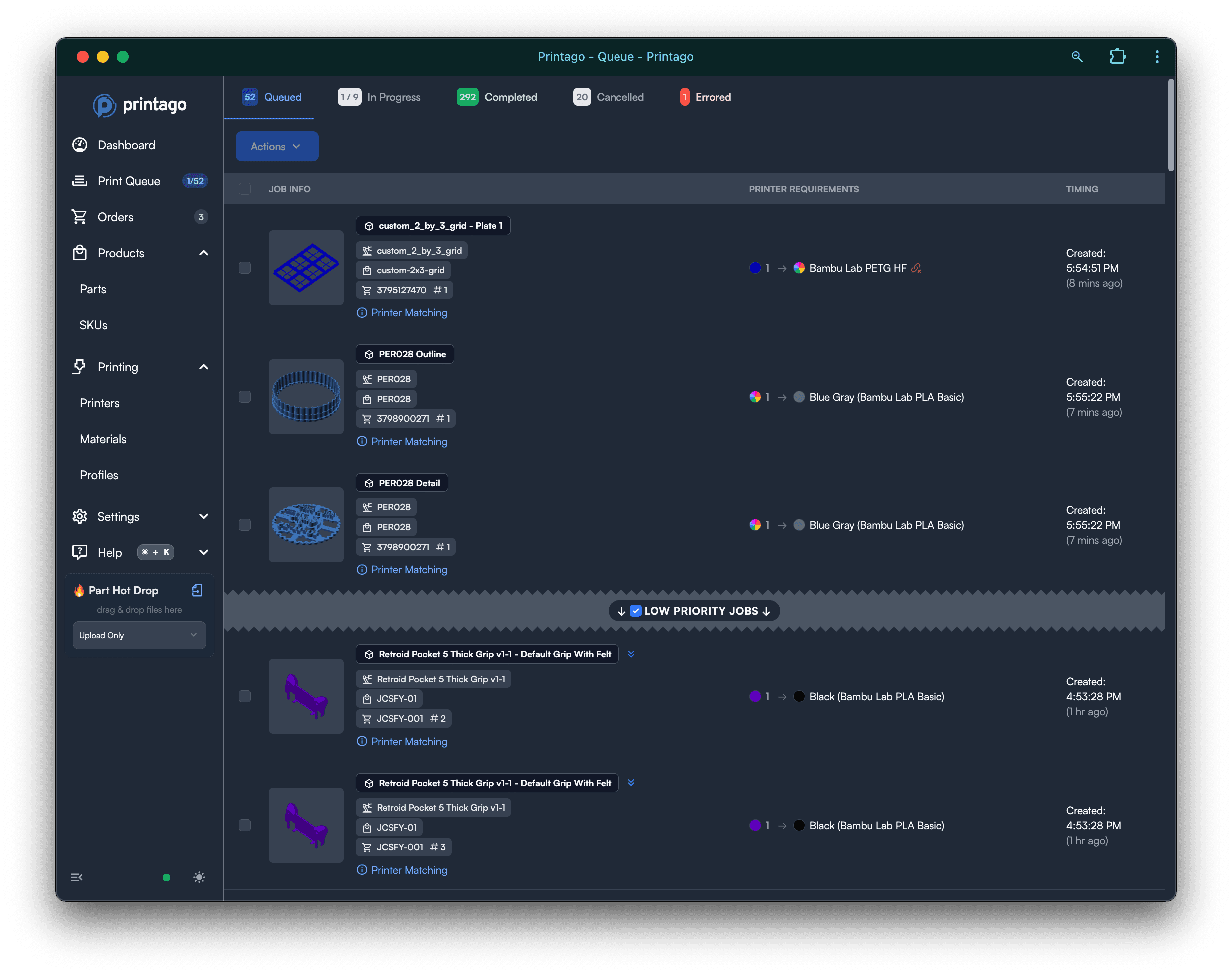 Rush jobs jump ahead. Drag to reorder anytime. Low and normal priority queuing keeps production flowing smoothly.